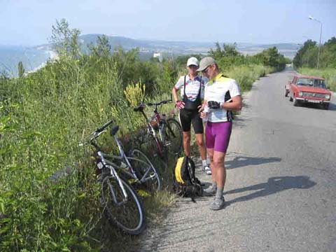 Велосипеды, взятые в прокат имеют 14 скоростей, тяжеленные, немного смешные, но все у них переключается нормально! Правда, подогнать под себя вел не удалось, поэтому катится не так комфортно, как привыкли, зато это оправдывает частые остановки :-) . В Болгарии, кстати, много машин советского производства. |