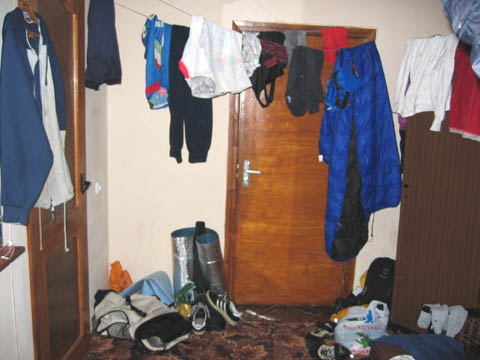 А вот и гостиница в Старой Русcе, куда мы прибыли в три часа ночи грязные и мокрые. Номер увешан сохнущим снаряжением. В гостинице Ирку спросили: "Это вы путешествуете с мужем и сыном?" Интересно, кого они приняли за сына (мы все одного возраста, а рожи у нас со Славосом были одинаково небриты)? |