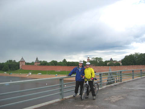 Лица комабайкеров светятся, так как они встретили самого дружелюбного милиционера в своей жизни, дело в том что по территории Кремля нельзя ездить на велах, надо ходить пешком, но за время похода байкер прирастает к седлу, это всем известно, поэтому спешиться иной раз и в голову не приходит. И вот останавливает нас милиционер и с радушной улыбкой спрашивает: «А вы, наверное, первый раз у нас, в Новгороде? Вы просто не знали что ехать на велосипеде нельзя, да? Будьте любезны сойти с велосипедов и идти пешком.» И все! Ради такой любезной просьбы мы и по мосту готовы были пешком туда-сюда ходить. Погода хорошая, общение с приятными людьми... Лица комабайкеров еще светятся, а тела расслаблены. Но с тыла уже подступают облака, видны полосы падения дождя. |